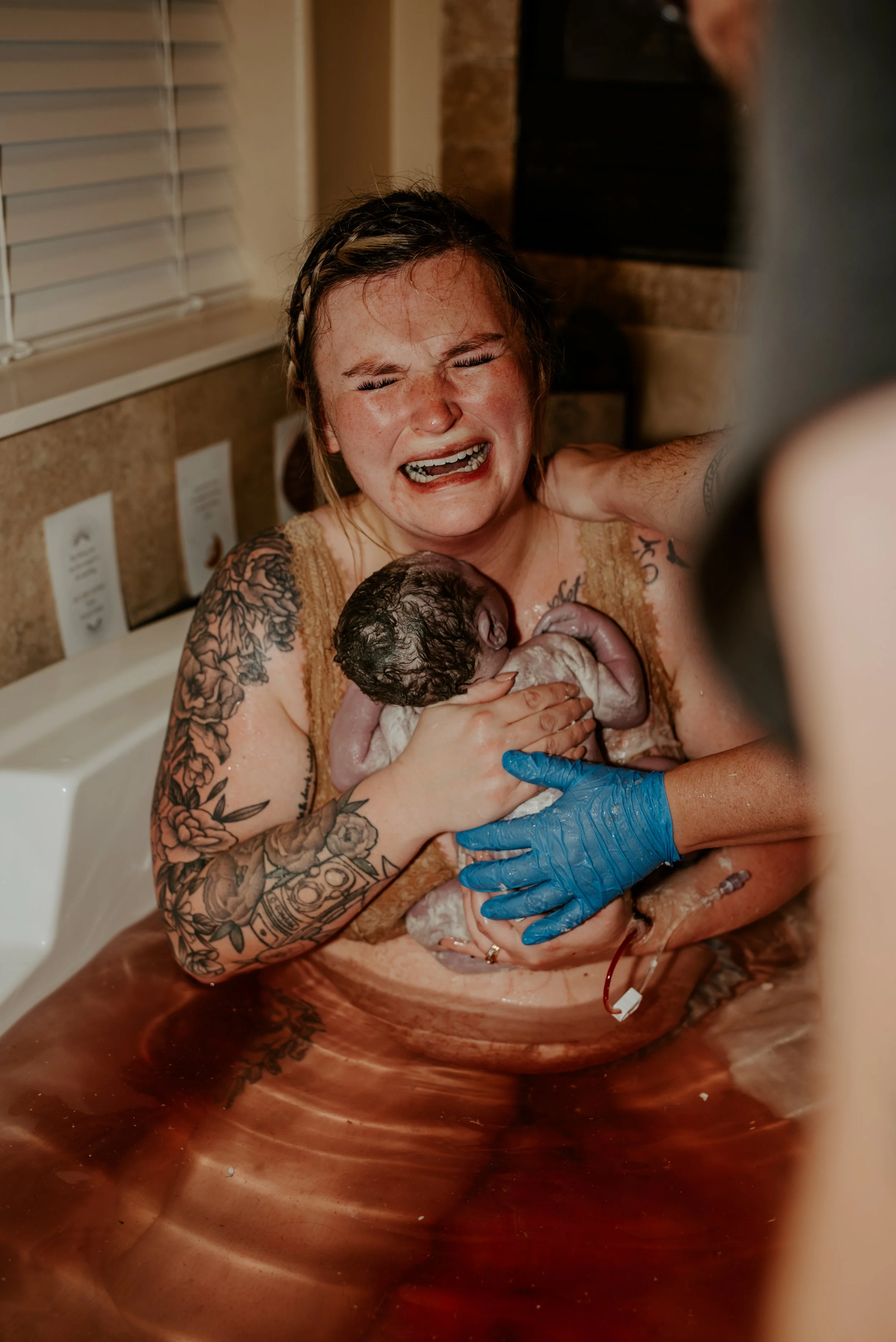 While we held her head, I felt the next contraction building. Jon removed his hand and I turned inward, using every ounce of strength and energy I had and pushed while keeping a hand on her head. Two pushes during that contraction and my daughter left my body, entering the world into my hands at 2:25am. I pulled her to my chest as Julia removed the amniotic sack from her head. Instinct kicked in and I started to stimulate her back, longing to hear that first cry. Julia reassured me that she was okay as she wiped her down. I gazed at my daughter and couldn’t believe how much she looked just like Murphy. Jon and I locked and shared a moment together. Finally, she let out a cry and I lost it. Finally hearing that awaited sound, but as I looked down at my little girl I watched her lips turn blue in my arms and Julia stepped in. Remaining calm, she continued to assure Jon and I that we were both ok as she gave her a few ventilations to help her breath. Moments felt like eternity. I knew my daughter was okay, but I still felt scared watching her need extra help. After a few ventilation breaths she let out a loud cry and continued to cry. I lost it. Crying tears of happiness and relief I would look up to Jon and stop crying and as soon as I looked back down at her, Id lose it all over again. Our daughter was here. Born safely. Born healthy. Born at home. My dream had come true.